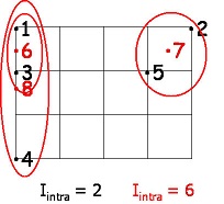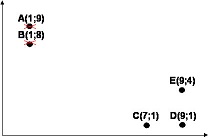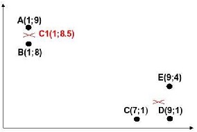 - La fusion de 2 groupes est représentée par le remplacement des 2 représentants de chaque groupe par le centre de gravité des 2 points, muni de la somme des masses.