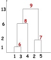 - L’indice de diamètre des parties à 1 individu est \(0\), et celui de la partie obtenue par fusion des 2 individus est proportionnel à la distance entre ces 2 individus.