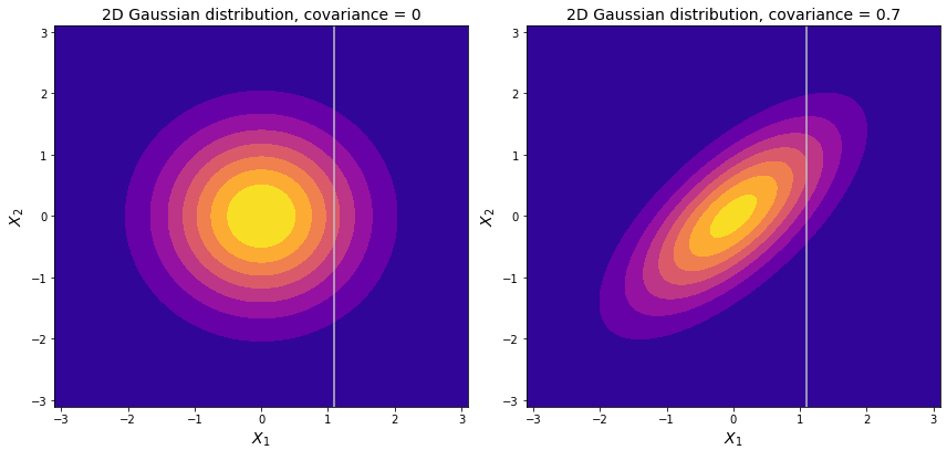 \[p(X_1 | X_2) = \frac{p(X_1, X_2)}{p(X_2)} = \frac{\mathcal{N}\left( \begin{pmatrix} X_1 \\ X_2 \end{pmatrix} | \begin{pmatrix} \mu_1 \\ \mu_2 \end{pmatrix}, \begin{pmatrix} \Sigma_{11} & \Sigma_{12} \\ \Sigma_{21} & \Sigma_{22} \end{pmatrix} \right)}{\mathcal{N}(X_2 | \mu_2, \Sigma_{22})}\]