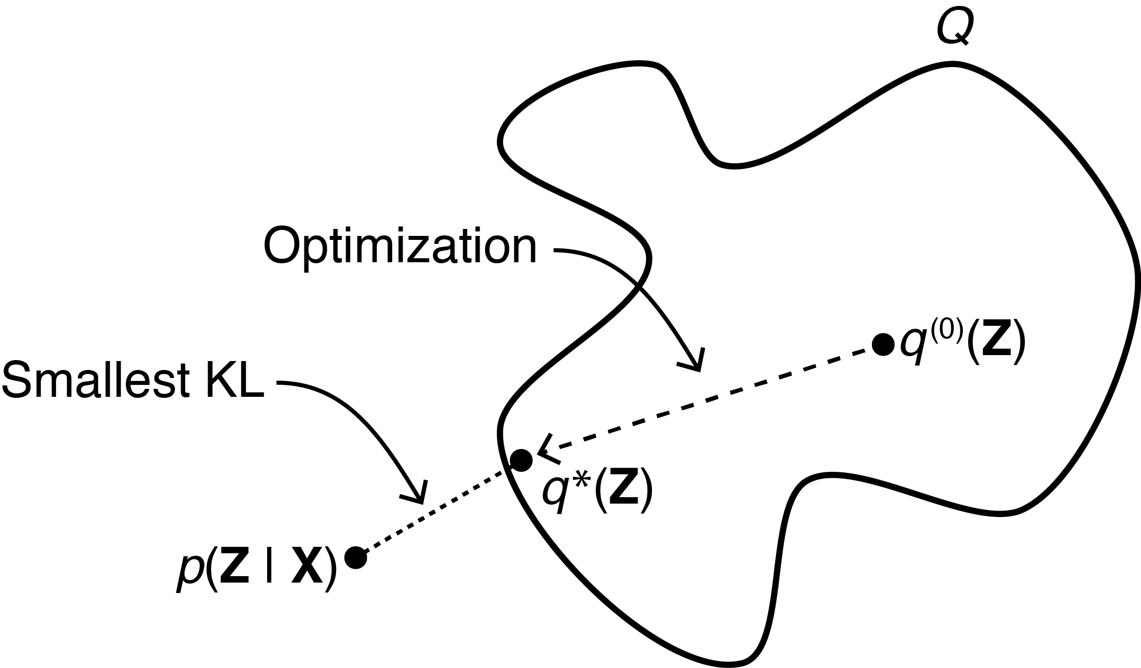 We now need to optimise over a family of distributions \(\mathcal{Q}\) to find the best approximation \(\hat{q}( \boldsymbol{\mu} , \mathbf{Z})\) that maximises the ELBO.