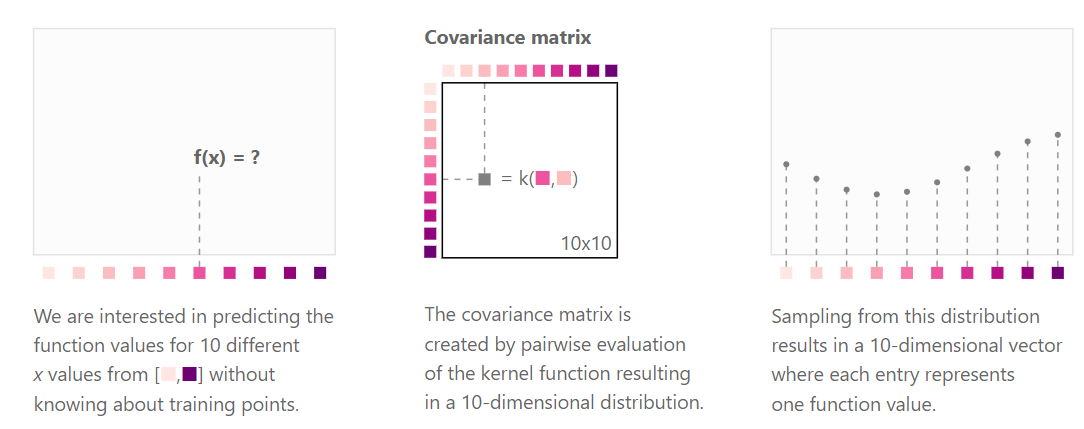 \[\begin{bmatrix} f_{\color{grey}{o}} \\ f_{\color{purple}{m}} \\ \end{bmatrix} \sim \mathcal{N} \left( \begin{bmatrix} m_{\color{grey}{o}} \\ m_{\color{purple}{m}} \\ \end{bmatrix}, \begin{pmatrix} C_{\color{grey}{o, o}} & C_{\color{grey}{o}, \color{purple}{m}} \\ C_{\color{purple}{m}, \color{grey}{o}} & C_{\color{purple}{m, m}} \end{pmatrix} \right)\]