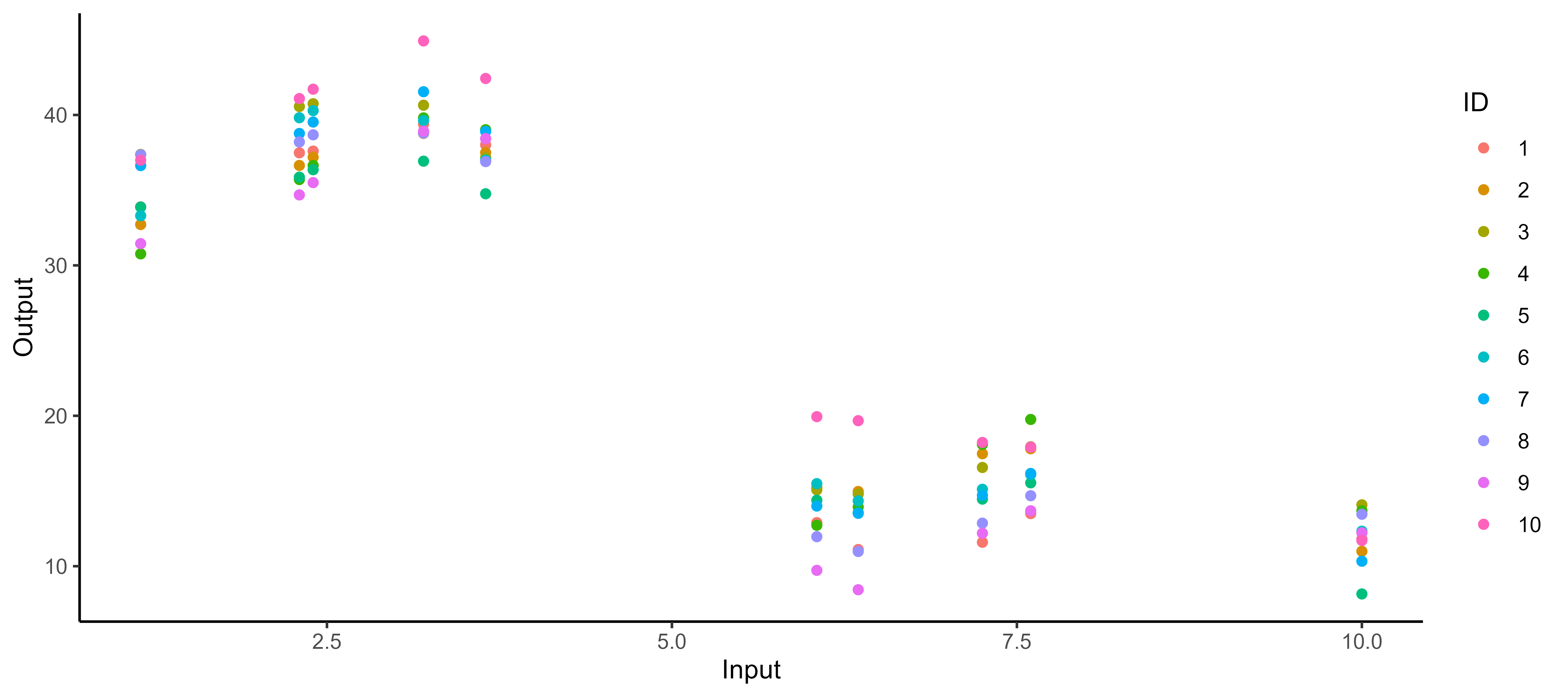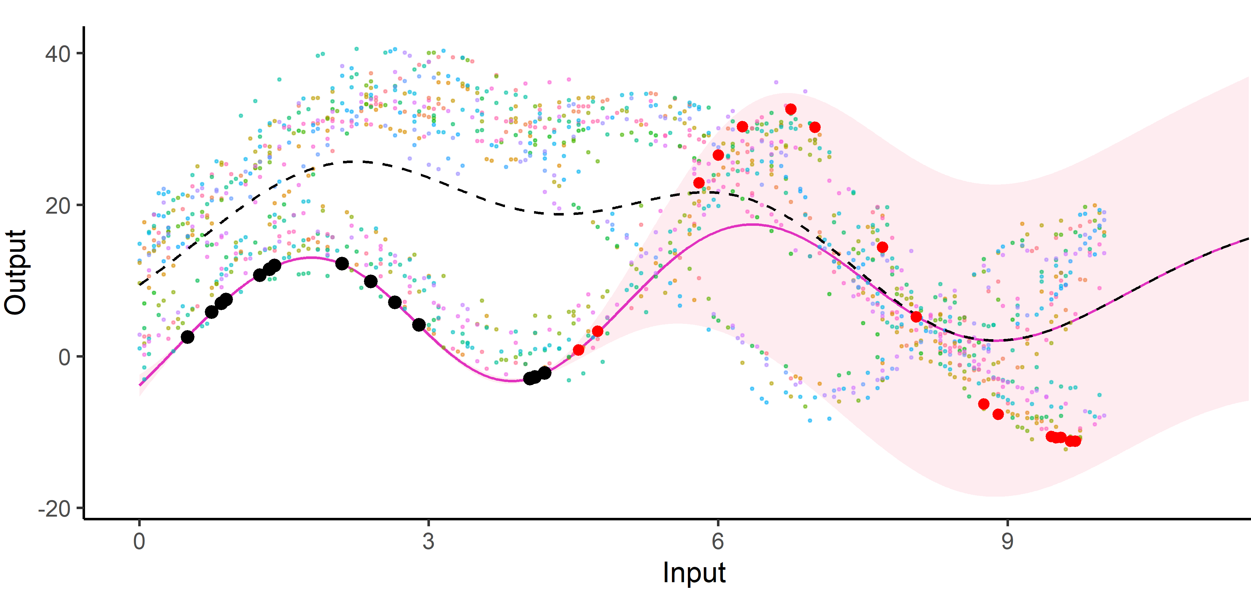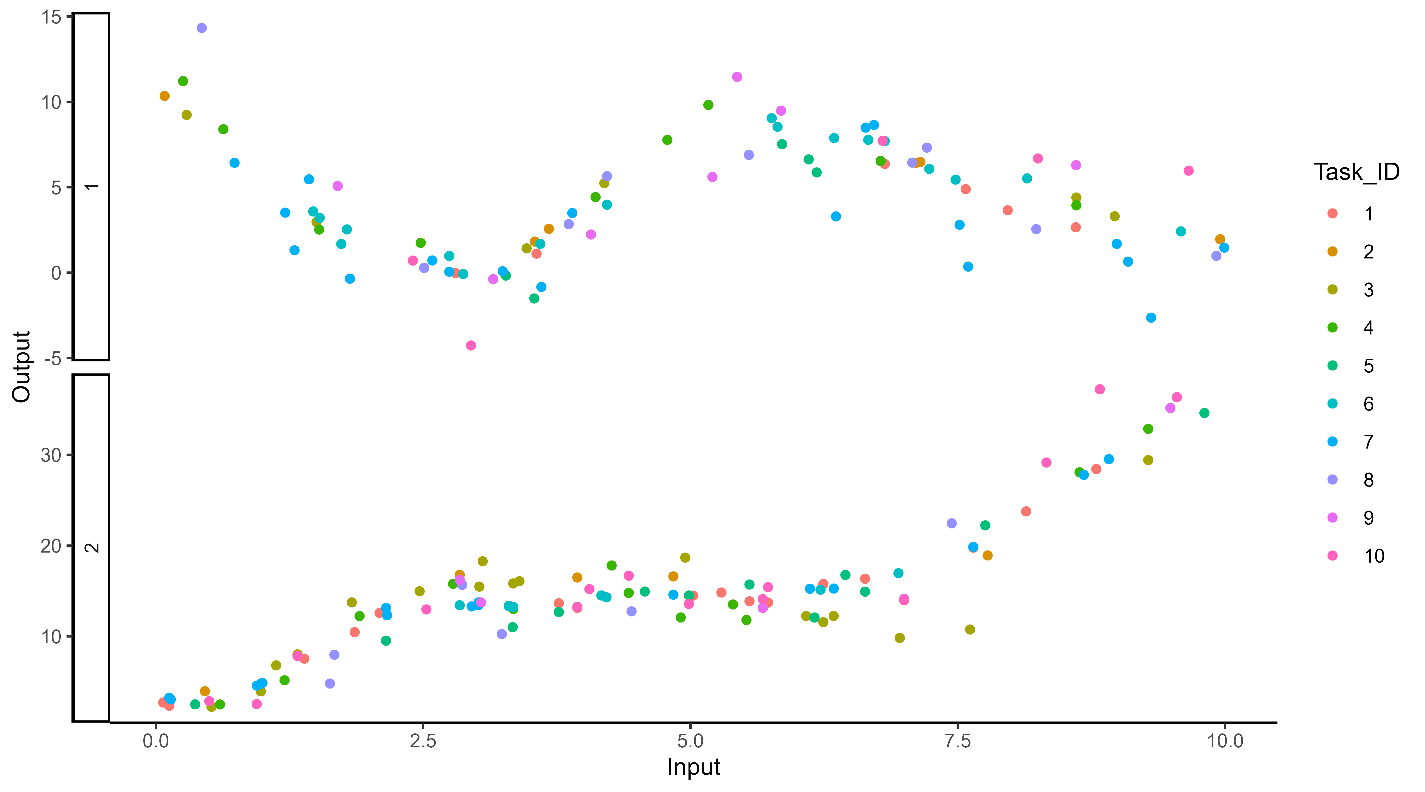For instance, this context could correspond to measuring two distinct Outputs for several Tasks over time, gathered into unknown groups (that we want to recover), and for which we want to predict missing values of one Output, or forecast future values of both.