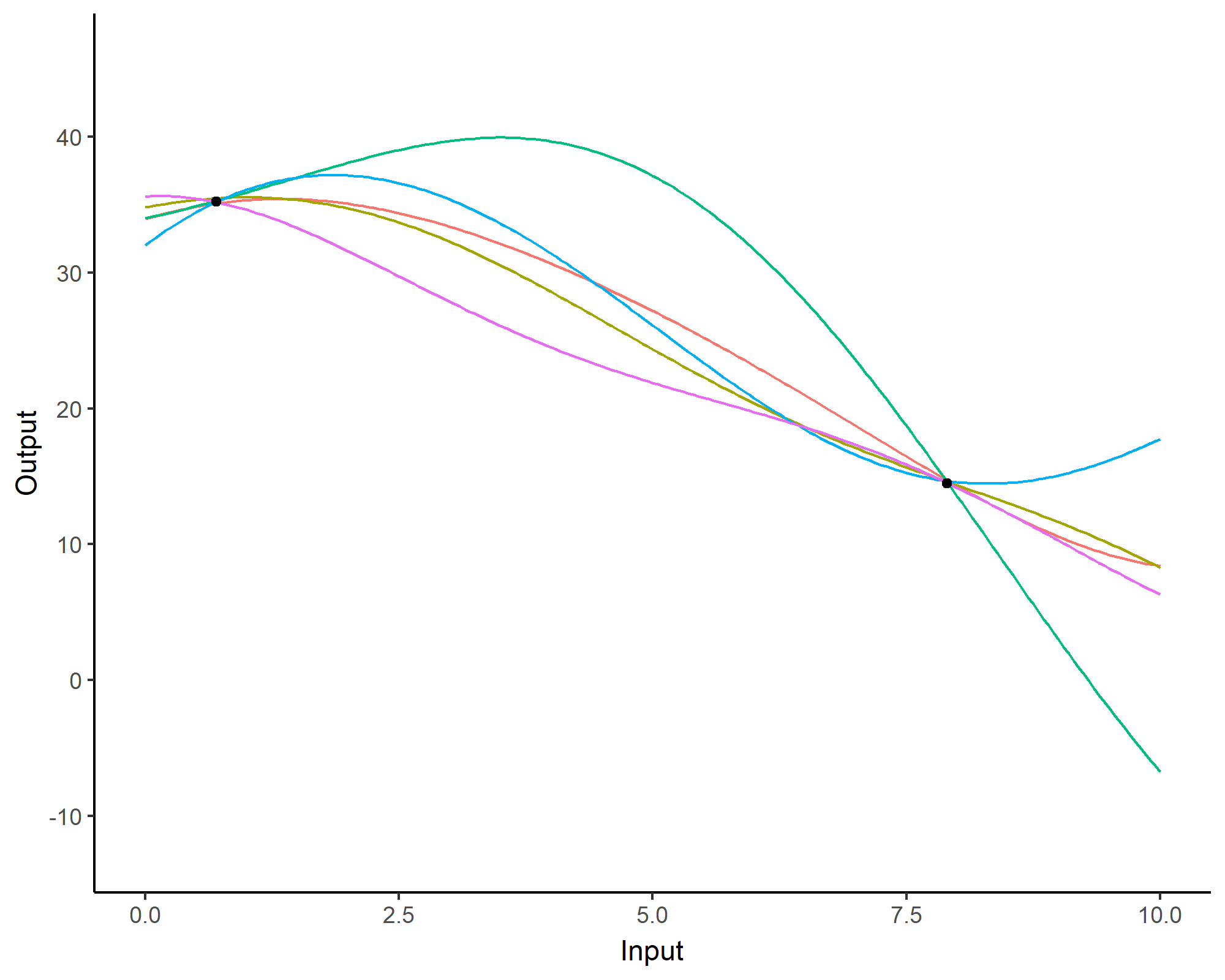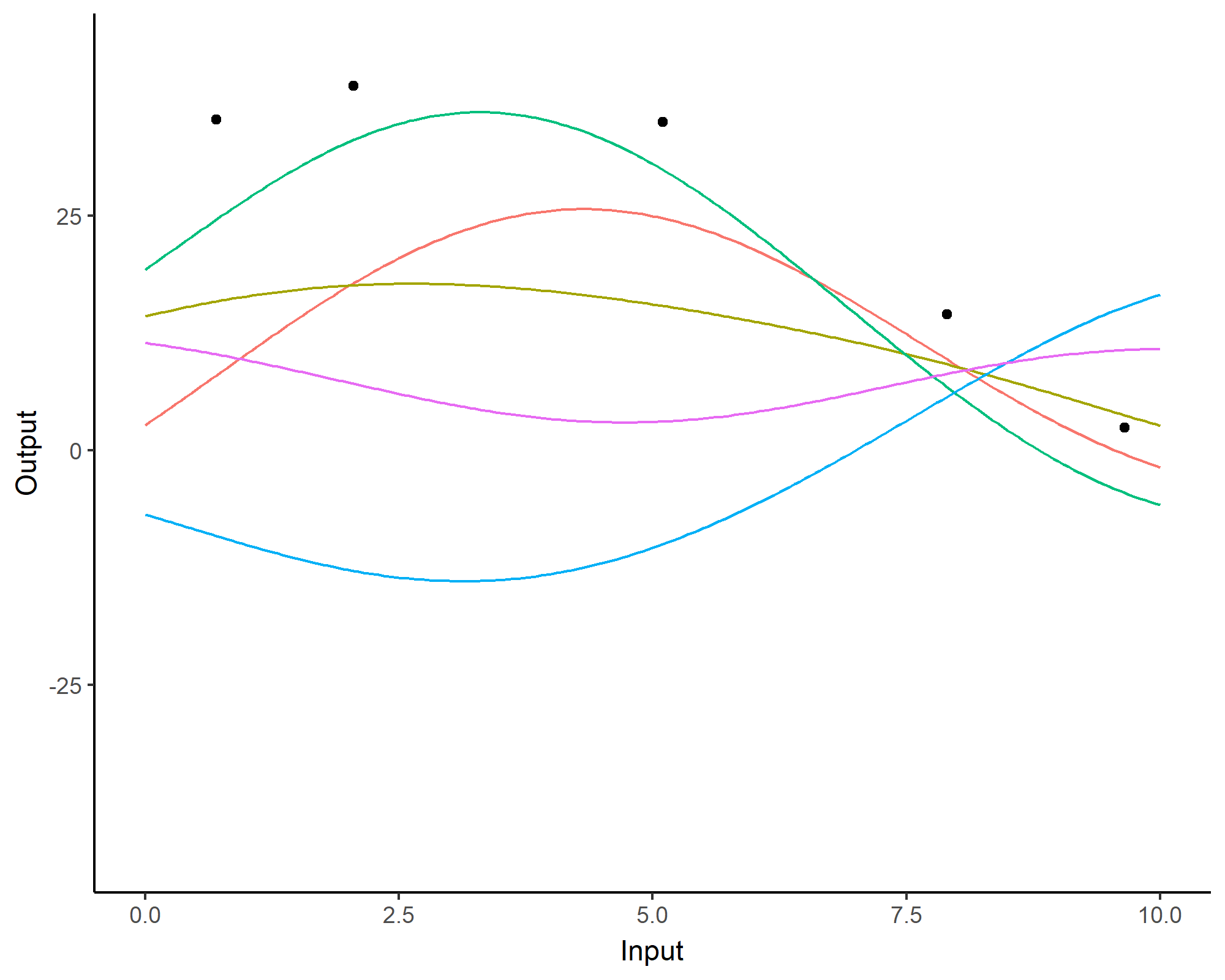 We can even consider linear regression as a particular GP problem, by using the Linear kernel: \[C_{lin}(x, x^{\prime}) = s_a^2 + s_b^2 (x - c)(x^{\prime} - c )\]