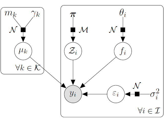 \[y_t \mid \{ \boldsymbol{\mu} , \color{green}{\boldsymbol{\pi}} \} \sim \sum\limits_{k=1}^K{ \color{green}{\pi_k} \ \mathcal{GP}\Big(\mu_{\color{green}{k}}, \Psi_t^\color{green}{k} \Big)}, \ \perp \!\!\! \perp_t\]