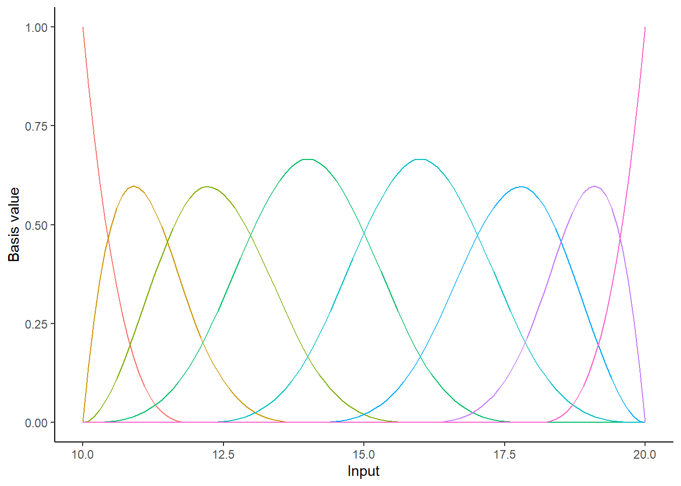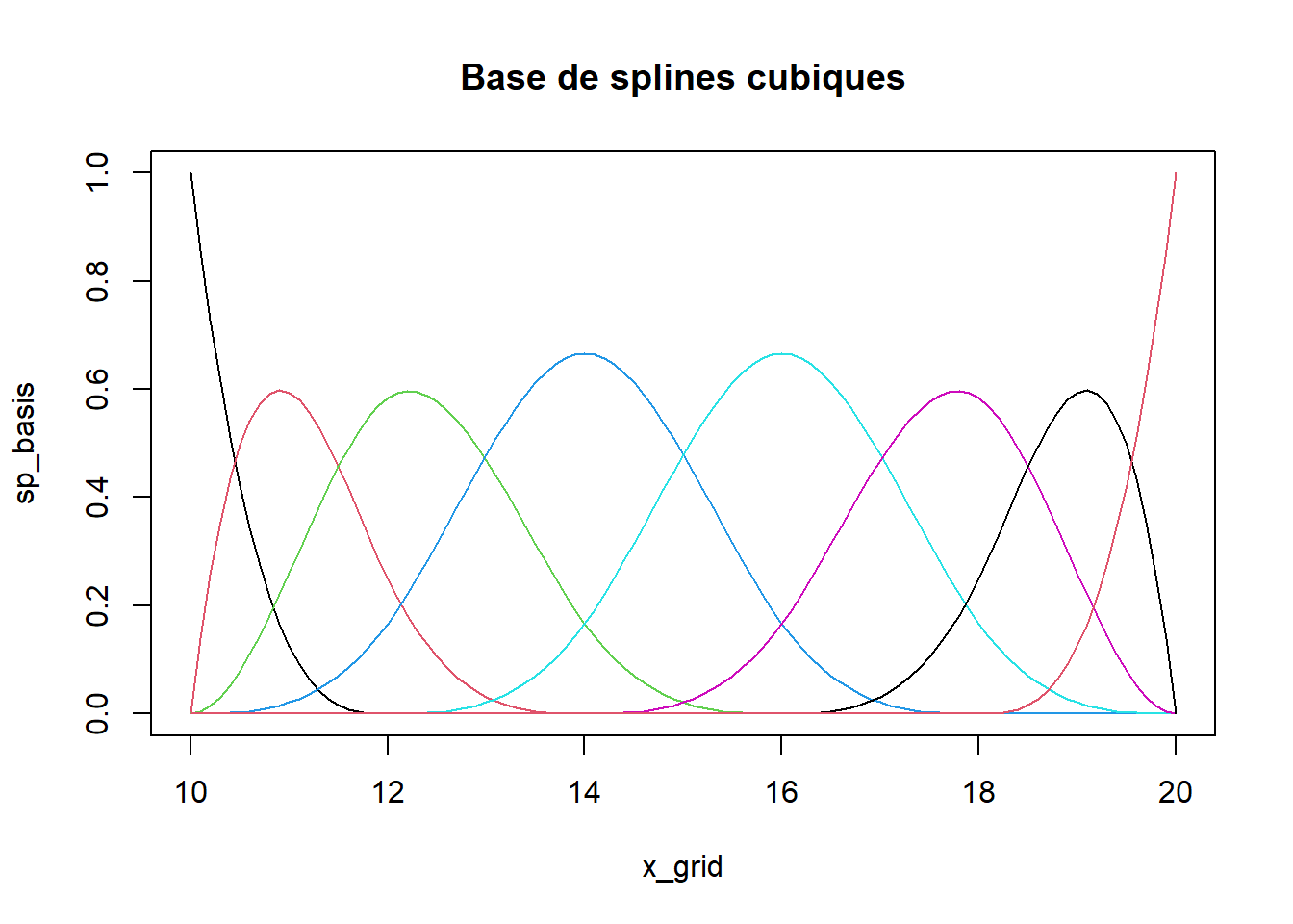 bs()du packagesplinespermet de définir une base de splines. Vous pouvez utiliser la fonctionmatplot()de base R ouggplot2pour afficher les différentes fonctions de la base.La syntaxe est proche d’une régression linéaire classique, mais en utilisant la fonction