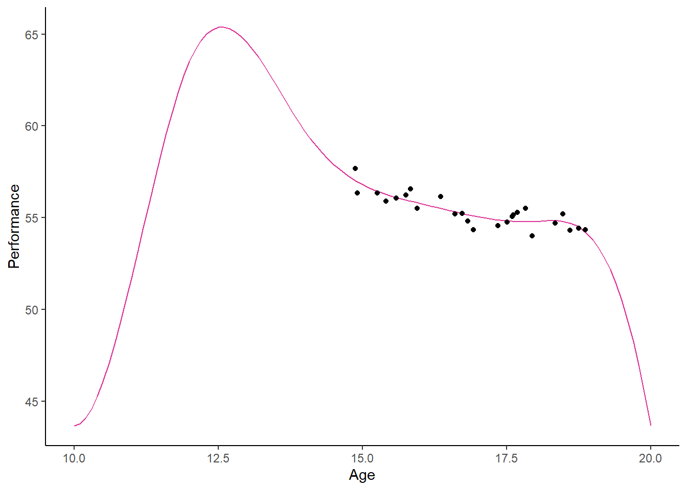 Extraire les données de performance au cours du temps, spécifiques à un.e athlète, et ajuster un modèle de régression spline sur ses données. Afficher les données et le courbe ajustée.