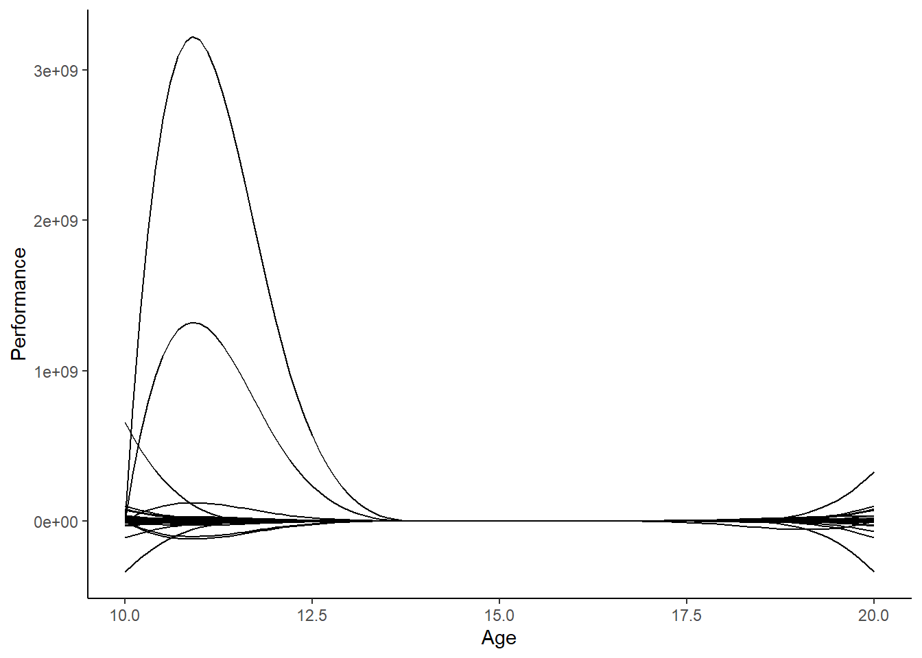 bs()pour définir la base de splines dans la formule. Vous pouvez utiliser la fonctionpredict()pour obtenir les valeurs ajustées sur une grille de points.La syntaxe n’est pas très intuitive pour faire une boucle sur tous les athlètes, je vous conseille d’aller directement dans l’onglet Solutions pour récupérer et executer le code.