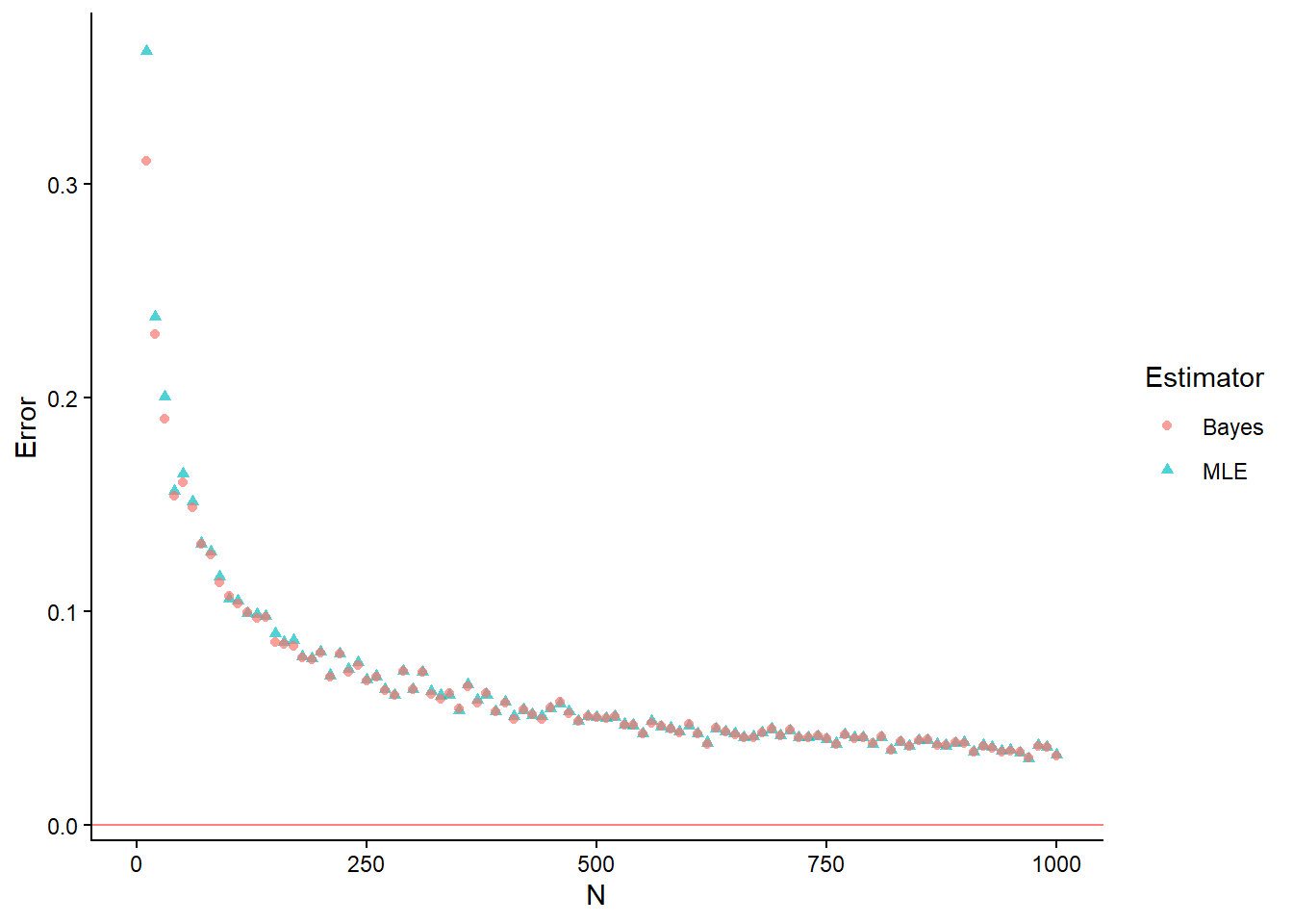 df2 = tibble(N = Ns, MLE = ML_avg, Bayes = Bayes_avg) |>