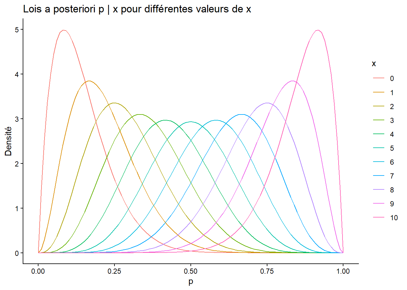 ggtitle("Lois a posteriori p | x pour différentes valeurs de x") +