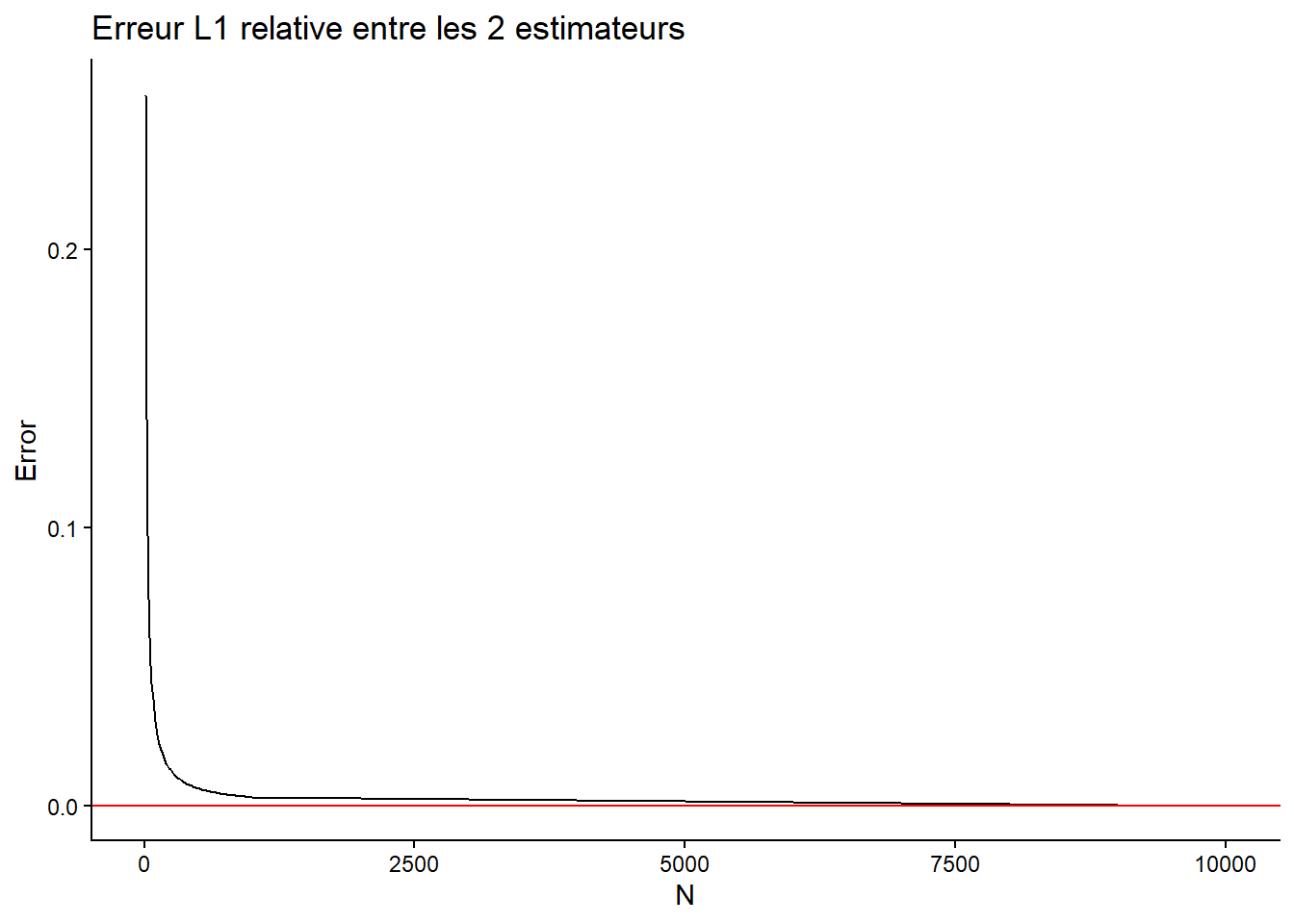 l’évolution de l’erreur relative entre les 2 estimateurs en fonction de \(N\).
