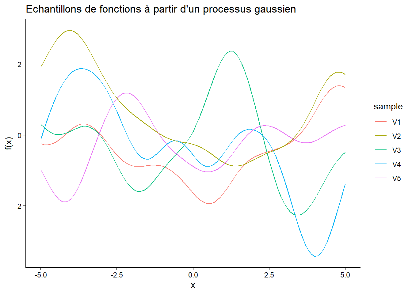Pour échantillonner des fonctions à partir d’un processus gaussien, vous pouvez utiliser la fonction mvrnorm(n, mu, Sigma) où n est le nombre d’échantillons, mu est le vecteur de moyenne (souvent un vecteur de zéros), et Sigma est la matrice de covariance.